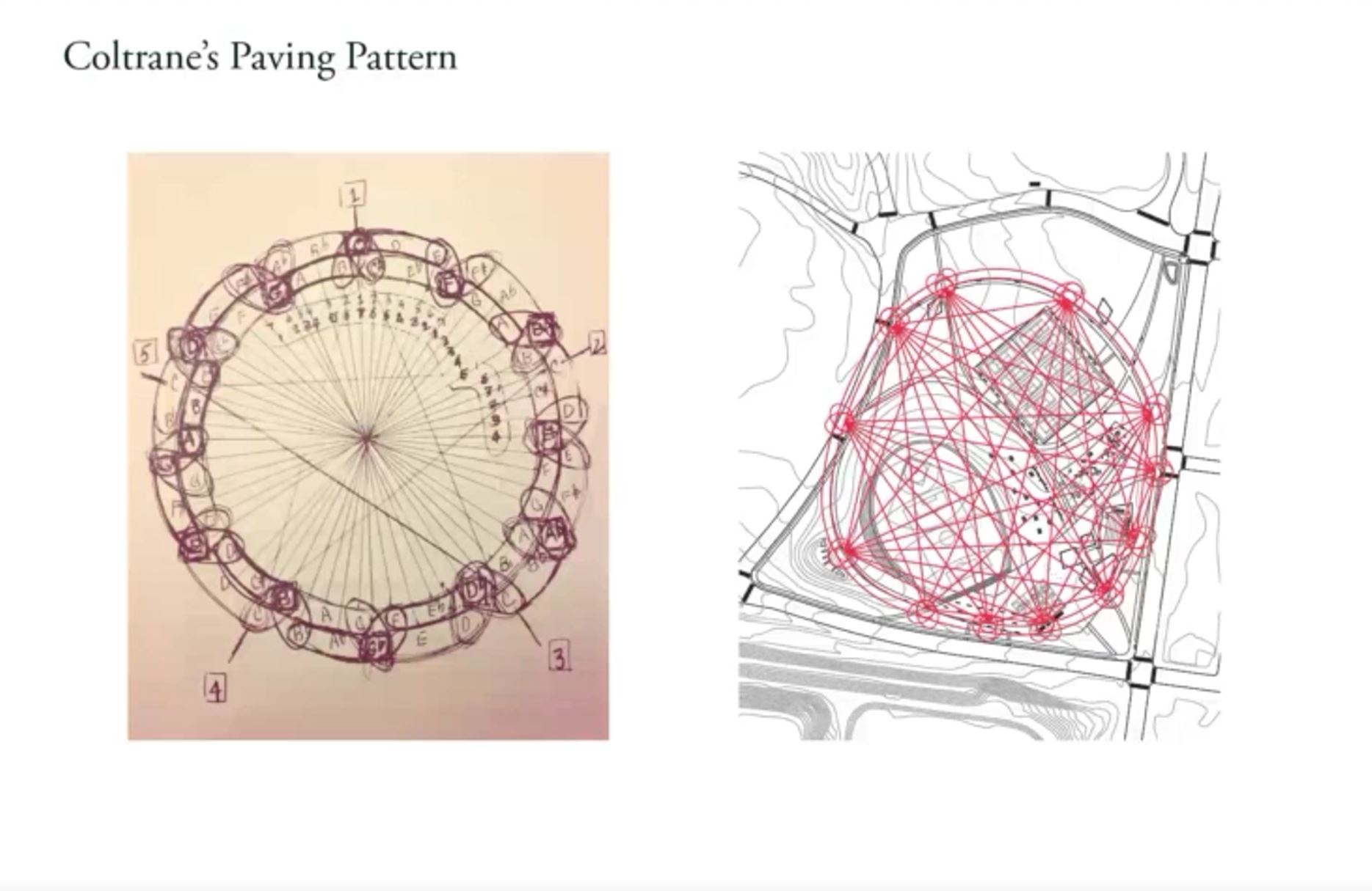 John Coltrane used to live in the neighborhood and he actually lived right here and he made this drawing of the mathematics of jazz and people were really proud of the fact that John Coltrane lived here. And we essentially applied that to the site and use that as a paving pattern in what we called Mander Plaza. And used that as a place for inscriptions about people, places, markers of the distance of walking.