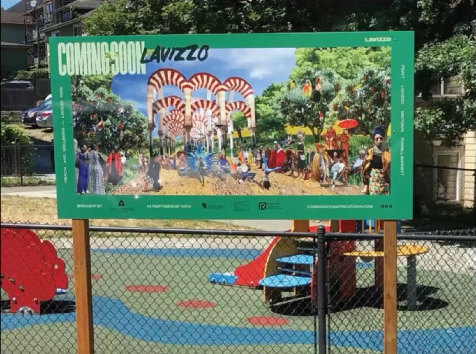This is the short version of a long story. So we were engaged in a number of engagement activities and design activities with them. This is a sign that you see all over the neighborhood nowadays. You see a Porsche, you see joggers, you got people that don’t look like the people who have been living there for a long time. So we made our own signs. We worked in the community to come up with these sort of Afro futuristic images of the neighborhood. Obviously, this image is corresponding to the site behind it.