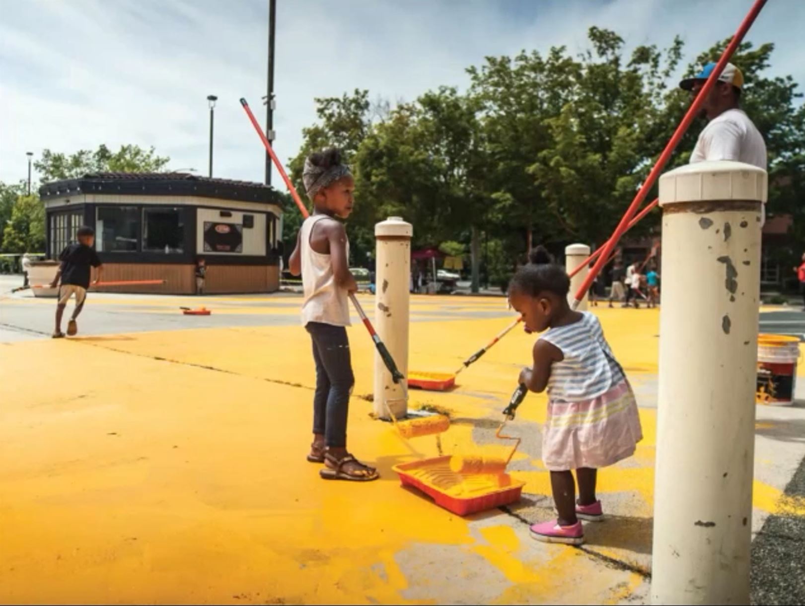 We had 300 people from the neighborhood come out and help paint. It still had a function as a parking lot. I think this is the most beautiful post office parking lot I’ve ever seen, I don’t know about y’all. This is in progress: you’ve got some plants in there, got the mayor to do a little ribbon cutting. So this is before, this is after.